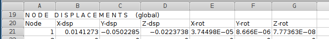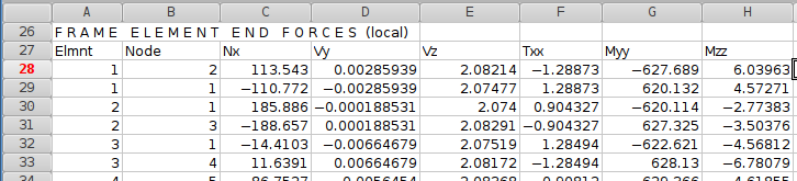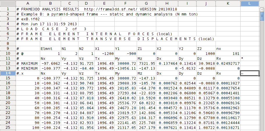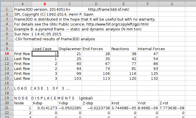 When run on a .CSV file, Frame3DD writes results as plain text to the named Output Data file and also writes results of the static analyses to a spreadsheet with a filename ending in ".CSV". For example, running Frame3DD as follows: