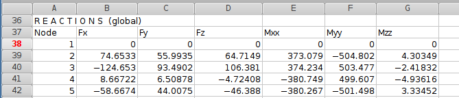 Reaction forces for load case 1 start at row 38 and end at row 42.