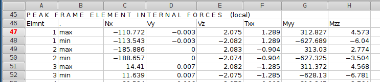 Peak internal element forces for load case 1 start at row 47 and end at row 54.