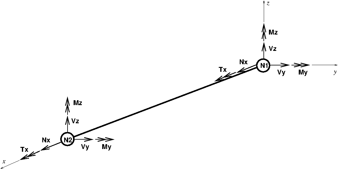 Frame3DD appends results to a plain-text Output Data file. Results from the most recent analysis are appended to the end of the Output Data file. Each section of the Output Data gives the date and time of the analysis, recapitulates the input information, gives node displacements in global coordinates, frame element end-forces in local coordinates, reactions in global coordinates, and natural frequencies and mode shapes in global coordinates.